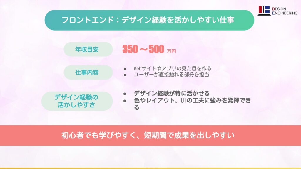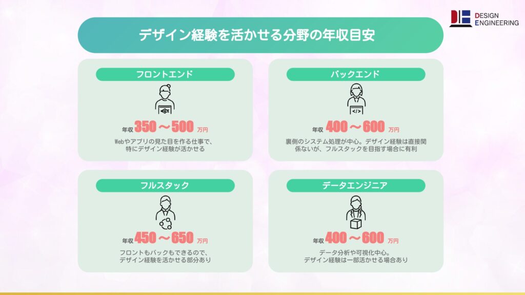 お役立ち資料 【資料ダウンロード】071_デザインからコードへ!最短で給与爆上げルート公開 2025.11.01 未経験からエンジニアに転向する場合の年収目安やスキル別の給与レンジを整理。デザイン経験を活かす方法やキャリア設計のコツを初心者にもわかりやすく紹介します。 ↓↓試し読みはこちら↓↓ 続きはこちら! 資料ダウンロード(無料) 【資料ダウンロード】070_職種別・年収ランキング2025!最も稼げるエンジニアは? 前の記事 【資料ダウンロード】075_知らなきゃ損!Webデザイナーが知るべき給与事情 次の記事