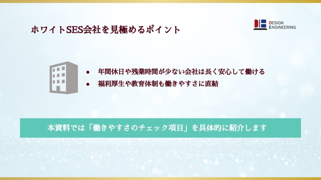 働きやすいSES会社の選び方を解説。年間休日、残業時間、福利厚生、教育体制など、初心者が快適に働ける会社を選ぶポイントを具体的に紹介します。